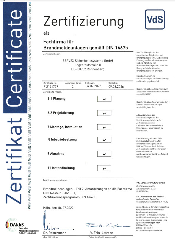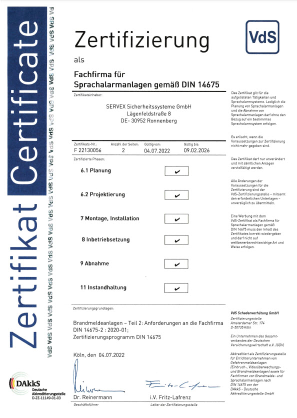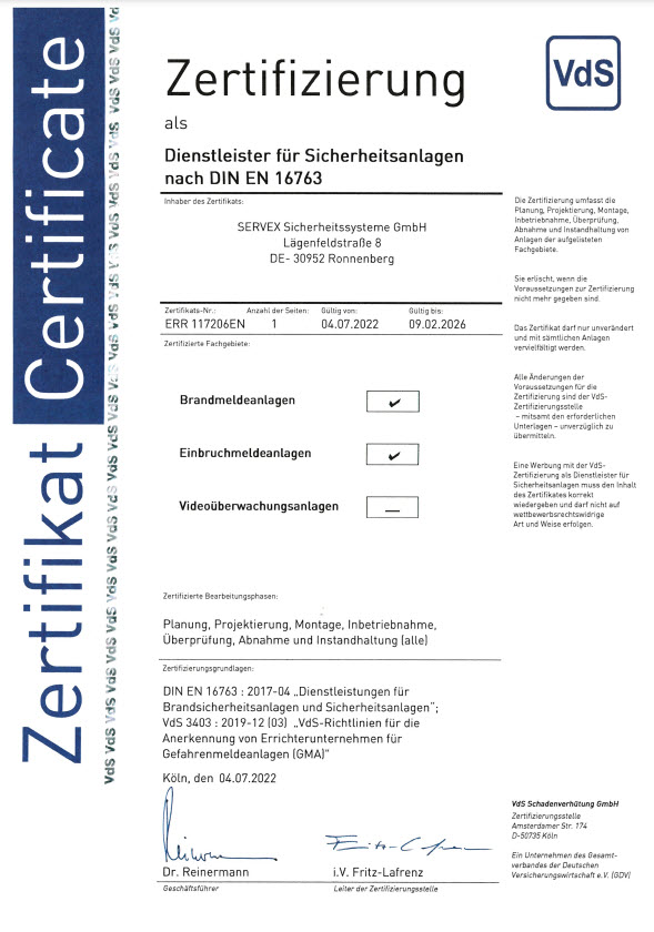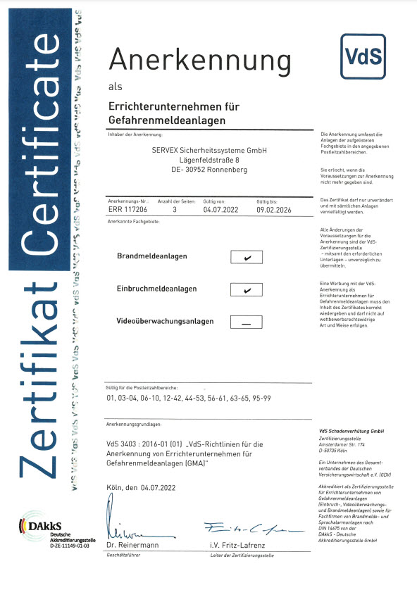 Die Fa. SERVEX Sicherheitssysteme GmbH ist im aktuellen Adressennachweis für Errichterunternehmen von Überfall- und Einbruchmeldeanlagen des Landeskriminalamtes Niedersachsen.
